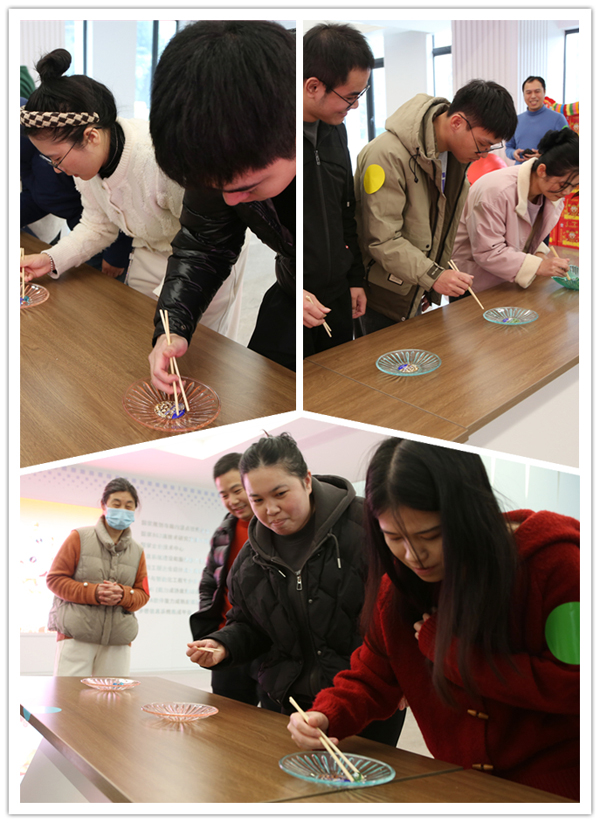 比赛伊始,大家便迅速进入状态,全神贯注地盯着玻璃珠,小心翼翼地用筷子夹取,力求又快又稳地将珠子传递给下一位队友。有的队员手法娴熟,动作连贯,玻璃珠在筷子间稳稳传递;有的队员则略显紧张,玻璃珠在中途落,引得一旁的观众一阵惊呼。现场气氛热烈,充满了欢声笑语。