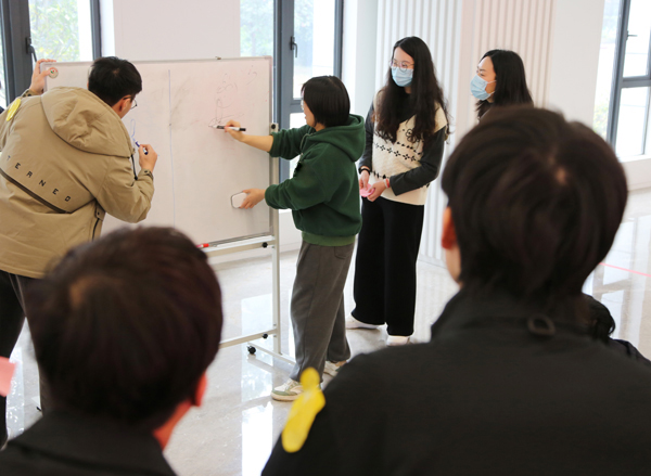 各小组的“画家”上台抽取词语后,迅速投入创作,在画板上挥动画笔,努力将抽象的词语转化为生动的画面。